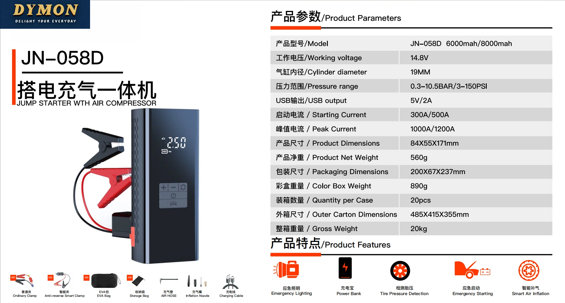 附加功能/Additional functions: lighting, tire pressure gauge, warning light, USB charging