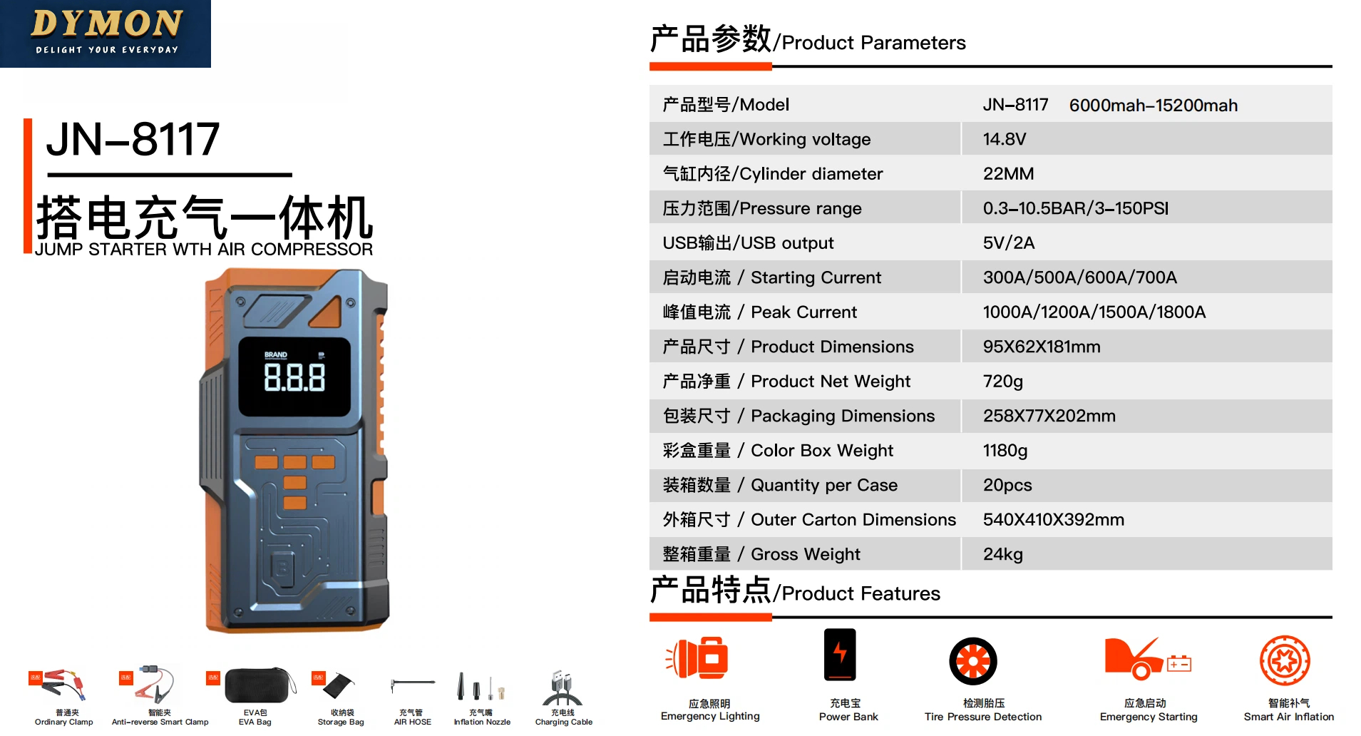 附加功能/Additional functions: lighting, tire pressure gauge, warning light, USB charging